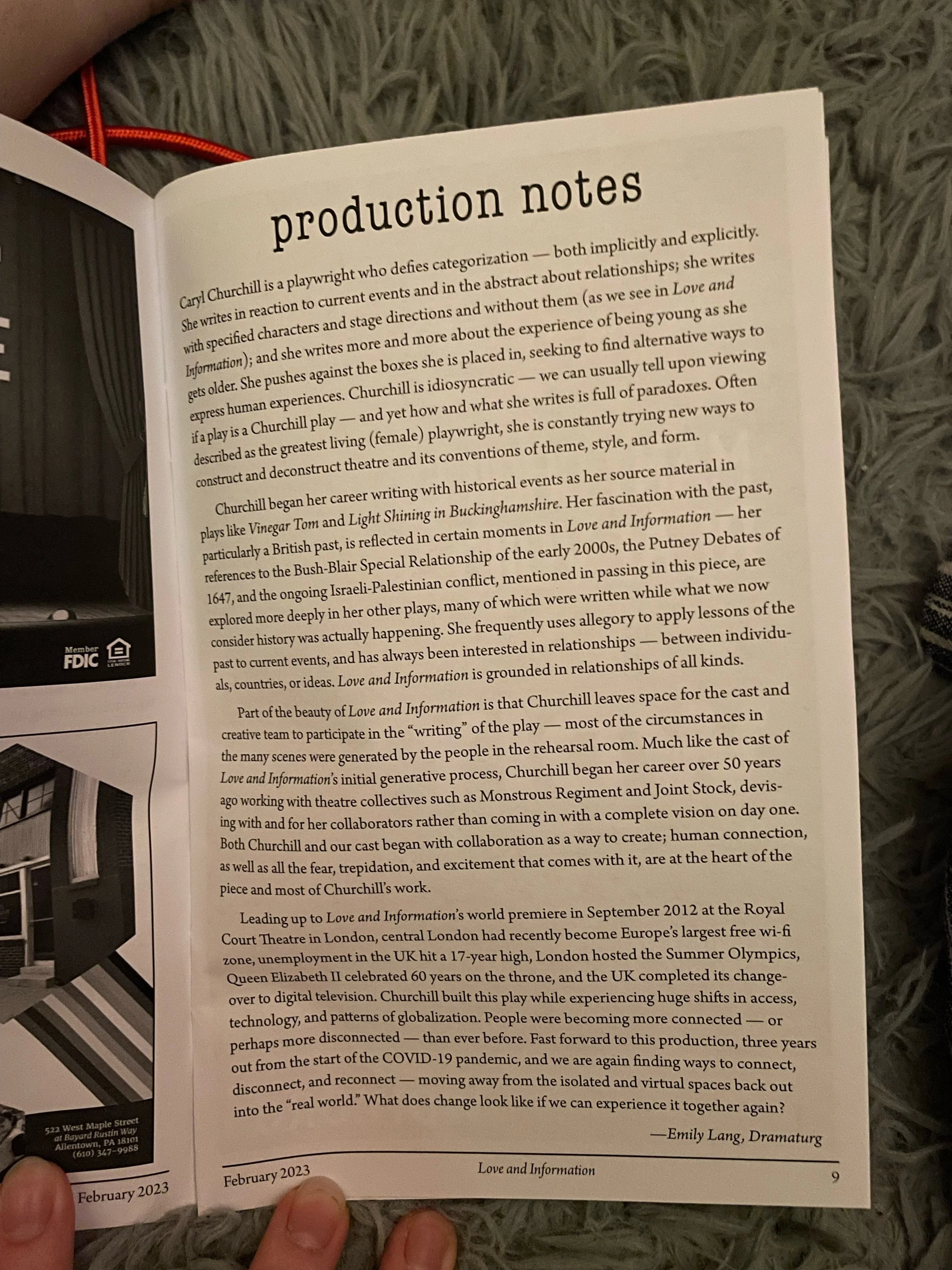 Love and Information by Caryl Churchill at the Dorothy Hess Baker Theater